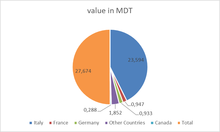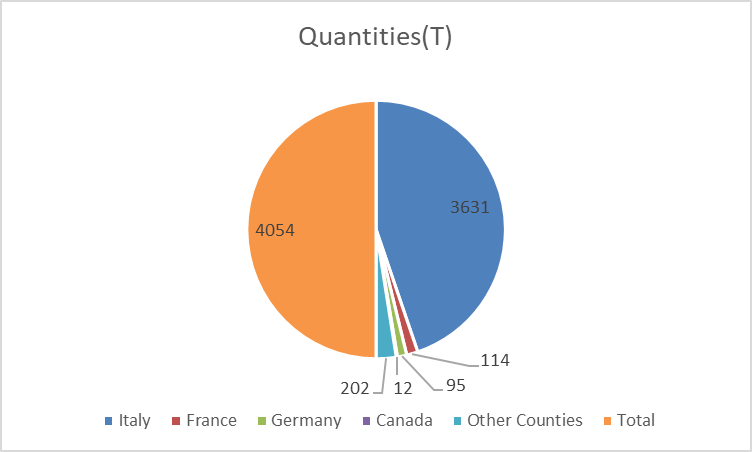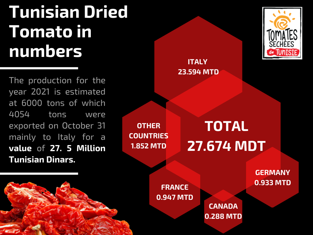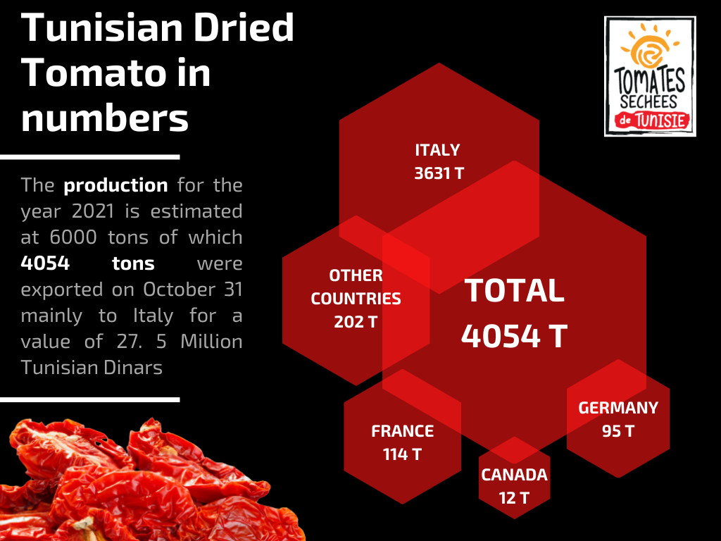 The production for the year 2021 is estimated at 6000 tons of which 4054 tons were exported on October 31 mainly to Italy for a value of 27. 5 Million Tunisian Dinars.