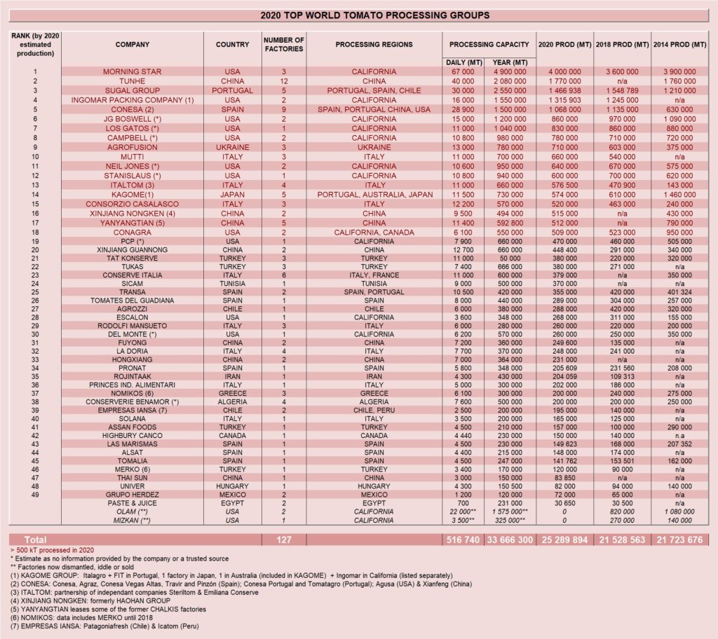 Two-thirds of the quantities of tomato processed worldwide in 2020 were processed by the companies of the world’s Top 50 in the sector to which Tunisia belongs.