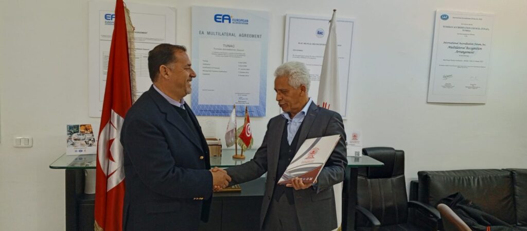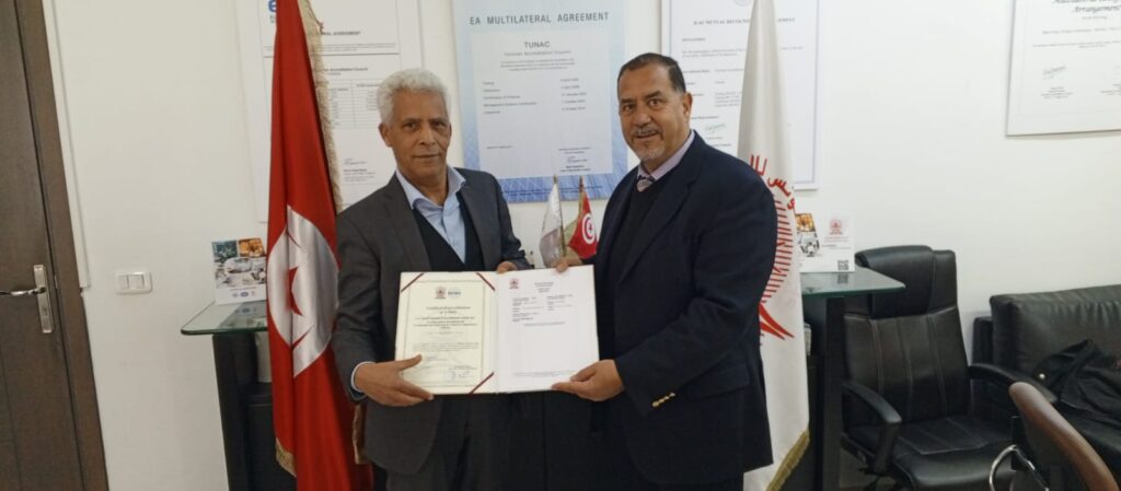 Presentation by Mr. Yassine WALI, General Manager of TUNAC, to Mr. Mohsen BOULARES, General Manager of the Canned Food Industries Group, of the accreditation certificate for GICA’s two analysis laboratories in accordance with the requirements of the Tunisian standard NT 110.200 v2017, international standard ISO/IEC 17425v2017 and TUNAC’s accreditation criteria, for the fields of food physico-chemistry and microbiology.